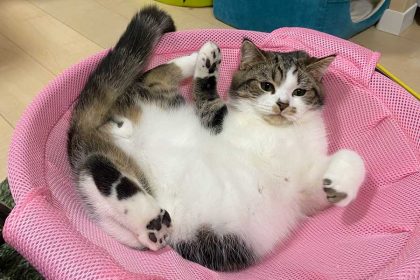 そんなコメントとともに投稿された写真には、ピンク色のベッドで仰向けになったねこが写っています。キジ白の被毛がかわいらしく、ふわふわのお腹を見せながら、リラックスした様子です。