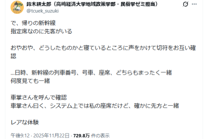 新幹線の指定席を予約したのに、すでに別の人が座っている。そんなとき、たいていはどちらかの勘違いや座席番号の見間違いというケースです。しかし、本当にシステム上でダブルブッキングされてしまったという、極めてレアな体験談がX(ツイッター)で話題に。日時、列車番号、号車、座席、すべてが「まったく一緒」だったという驚きの出来事について、投稿者で、高崎経済大学地域政策学部准教授の鈴木耕太郎(@tcuek_suzuki)さんにお話を伺いました。