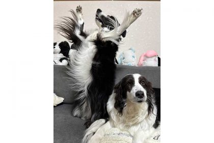 そんなコメントとともに投稿された写真には、2匹のいぬが写っています。ソファの左側にいるいぬは、両前脚を高く上げ、踊っているかのよう。顔を上に向け、白と黒の美しい長い毛も、躍動感たっぷりに宙を舞っています。