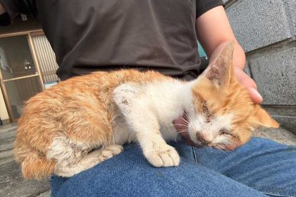 そんなコメントとともに、虎崎さんが投稿した写真には、保護した直後の子ねこが写っています。茶白の毛並みは汚れ、目ヤニがひどく、目も開けられない状態。虎崎さんの膝の上で、力なくうずくまっています。