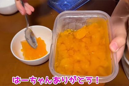 ある日、Amiさんの妹の「はーちゃん」が、保存容器を手にリビングにやってきました。「はい、座って!」と声をかけながら、容器の中身を見せると、そこには手作りのミカンゼリーが入っていました。それにまず反応したのは、ソノくんとリノくん。ソノくんは両手を大きく上げて「わぁ~」と声をあげ、大興奮です。