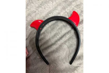 2枚目に写っていたのは、修理後のカチューシャです。赤いツノが2つ付いていますが、よく見ると、片方のツノが外側に曲がっています。悪魔のツノというより、まるで子犬の耳のような状態です。