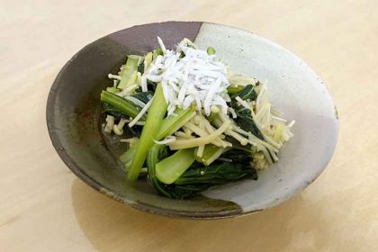 小松菜はアクが少なく、生でも食べられます。魚介類と合わせてサラダにしてもおいしいです。シラスや干しシイタケと合わせてお浸しなどにして食べると、カルシウム摂取に良い一品になります。