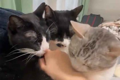 そんなコメントとともに投稿された動画には、飼い主さんが伸ばした手に反応する3匹のねこが写っています。画面の左側で、親指のあたりを舐めているハチワレ柄のねこと、右側から手首のあたりに顔を寄せているキジ白柄のねこ。そして、その奥から様子を見つめるもう1匹のねこ。