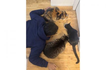 そんなコメントとともに投稿された1枚の写真。そこには、フローリングの床にうつ伏せになっている男性の姿が。顔のすぐそばには3つのフードボウルが置かれ、3匹のねこたちが夢中になってごはんを食べています。男性とねこたちの距離は、わずか数センチ。男性がねこの集会に参加しているかのような、不思議な一体感が漂っています。