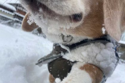 あまりに至近距離で、ビーグルの顔は写真に収まっていません。しかし、アゴ下や体に絡みついた雪玉までくっきりと見えます。心配しているように見えなくもないですが、「遊べる!」と言わんばかりの、あふれ出る興奮が伝わってくる一枚です。