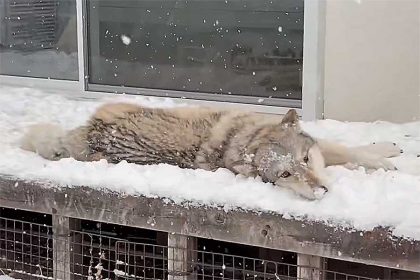 そんなコメントとともに投稿された動画には、凛々しい顔立ちのウルフドッグが映っています。雪が舞い散るなか、木製のデッキで背中をこすりつけ、“ゴロスリ”を堪能しているようです。