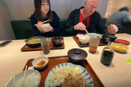 旅行2日目の朝、ゆっくりと準備を整えた一行は、ホテル近くにある定食店でブランチをすることに。それぞれが食べたい定食を選びます。