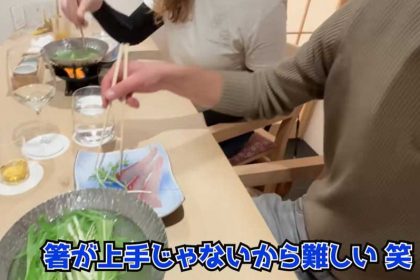 寿司を堪能する前に、ふたりにはブリしゃぶが提供されました。Daisukeさんから「まず野菜を鍋に入れて」と説明を受けると、フランズさんは「箸が上手じゃないから難しい」と言いながらも、笑顔を見せます。