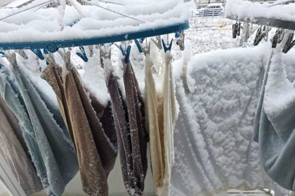 そんなコメントとともに投稿された写真には、ベランダに干された洗濯物が写っています。雪がピンチハンガーの上に積もり、干されたタオルにもびっしりとついている状態です。