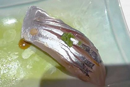 マグロやヒラメの握りに舌鼓を打つなか、3人にアジの握りが提供されました。Daisukeさんが「味は、少し魚の風味が強いかも。アジの上の緑は刻みネギ!」と説明すると、サラさんは「とてもきれいな魚」と、アジに見入ってしまいます。