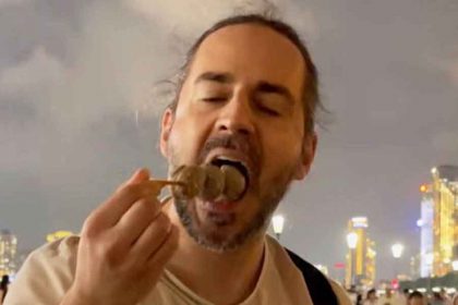 舞さんが心配そうに見守るなか、ベンさんは串に刺さった肉団子や昆布を次々と口に運びます。じっくりと味わいますが、口には合わなかった様子。「過去最悪レベルの中華食べた。魚団子や肉団子、何が入ってるかは神のみぞ知る」と、味の感想を淡々と語ります。