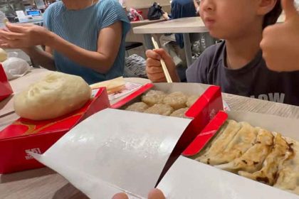 大阪駅で551の餃子やシュウマイ、肉まんを購入した一家は、飲食スペースへ移動してさっそく堪能。楽しみすぎて待ち切れない様子のミオくんは、大きな餃子を口に運ぶと「おいしい!」とサムズアップを見せました。