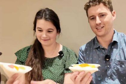 トレヴァンさんは「すごくおいしそう。パッケージは素敵だ」と目を輝かせ、思い切りかぶりつきました。「新鮮なフルーツだね。今日作られたのがわかるね。このパイナップル、本当においしい」と、さっそく気に入った様子。アンナさんも「カリフォルニアのサンドよりおいしいです」と笑顔を見せました。
