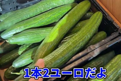 ドイツの実家から、近くのスーパーマーケットへ買い物に出かけたレナさん一家。野菜売り場でキュウリを手に取ると、日本より大ぶりなサイズはさておき、価格に目を疑います。タカさんは「1本2ユーロだよ。1本380円。高! ビビってるよこれはw」と驚愕。レナさんも「日本のキュウリの4~5本くらい」と苦笑いです。