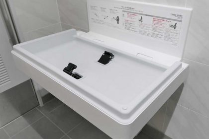 1か月の里帰りを経て、日本に戻ったレナさん一家。外出中、ルイくんのおむつ交換が必要になりましたが、トイレに入るとおむつ台が当たり前のように設置されていました。