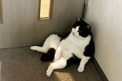 そんなコメントとともに投稿された写真には、部屋の隅で壁にもたれかかるように座る白黒のハチワレねこが写っています。後ろ足を前に投げ出し、お腹を見せるように腰を下ろした姿がまるで人間のようです。