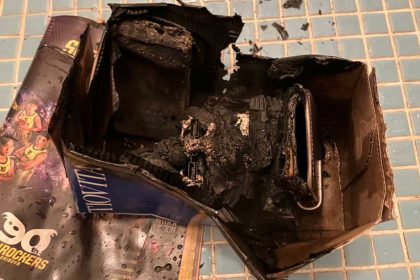 投稿された写真には、焦げた箱のようなものが写っています。箱の中に黒く溶けたモバイルバッテリーの残骸が確認できますが、大部分は焼け焦げて変形しているようです。