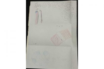 手紙には、一番上に「私の好きなもの」というタイトルが書かれていました。さらに「スキー」「チョコ」「うみ」を表現する、なんとも愛らしいイラストと文字が並びます。