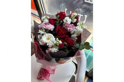 投稿には、息子さんが用意した花束の写真も。深紅のバラを中心に、白いガーベラ、縁に紫がかったカーネーションなどが組み合わさった華やかなものでした。ボルドーのラッピングで包まれた、高校卒業という旅立ちの日にぴったりの美しい花束です。