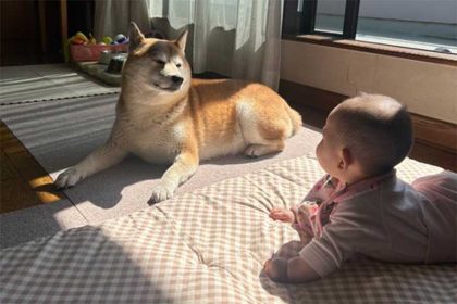 その視線の先には、同じように床に伏せてくつろぐ柴犬がいます。少し目を細め、穏やかでありながらもどこか貫禄のある表情で赤ちゃんを見つめ返す姿は、まるで赤ちゃんの成長を自分のことのように喜んでいるようです。優しくも頼もしい“先輩”の顔を覗かせています。