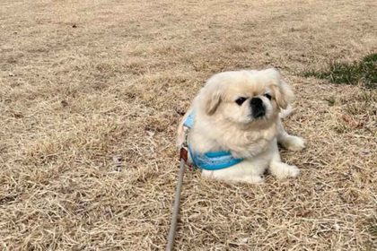 そんなコメントとともに投稿された写真には、枯れ草で覆われた芝生の上に座り込むいぬが写っています。水色のハーネスを着け、右前足を少し浮かせるような不自然な体勢でペタンと座り込んでいます。