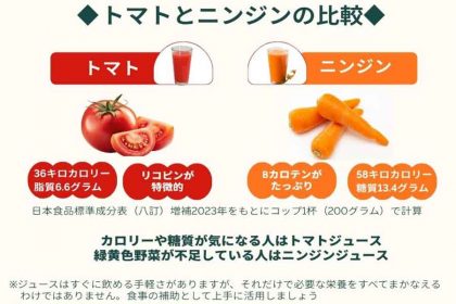 トマトジュースにもニンジンジュースにも、それぞれ良さがあります。ただし毎日飲むというと、気になるのはカロリーや糖質かもしれません。