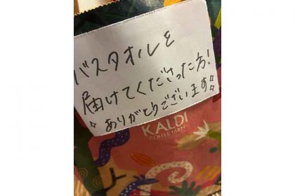 そんなコメントとともに投稿された写真に写っていたのは、手書きのお礼メッセージと、いくつかのお菓子が詰まった袋。メッセージには、「バスタオルを届けてくださった方! ありがとうございます」と感謝の言葉が綴られています。