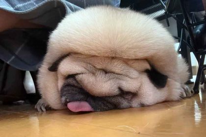 顔の皮膚や被毛が重力で前に押し出され、目や鼻が埋もれるほど潰れています。口元からはピンク色の舌がちょこんとはみ出しており、完全に脱力しきった様子。丸くて平べったいフォルムが印象的です。