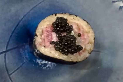 前菜を楽しんでいると、ふたりの前に生肉の巻き寿司が運ばれてきました。添えられた小さな箱を開けると、なんと中にはキャビアが。ふたりは思わず仰天します。